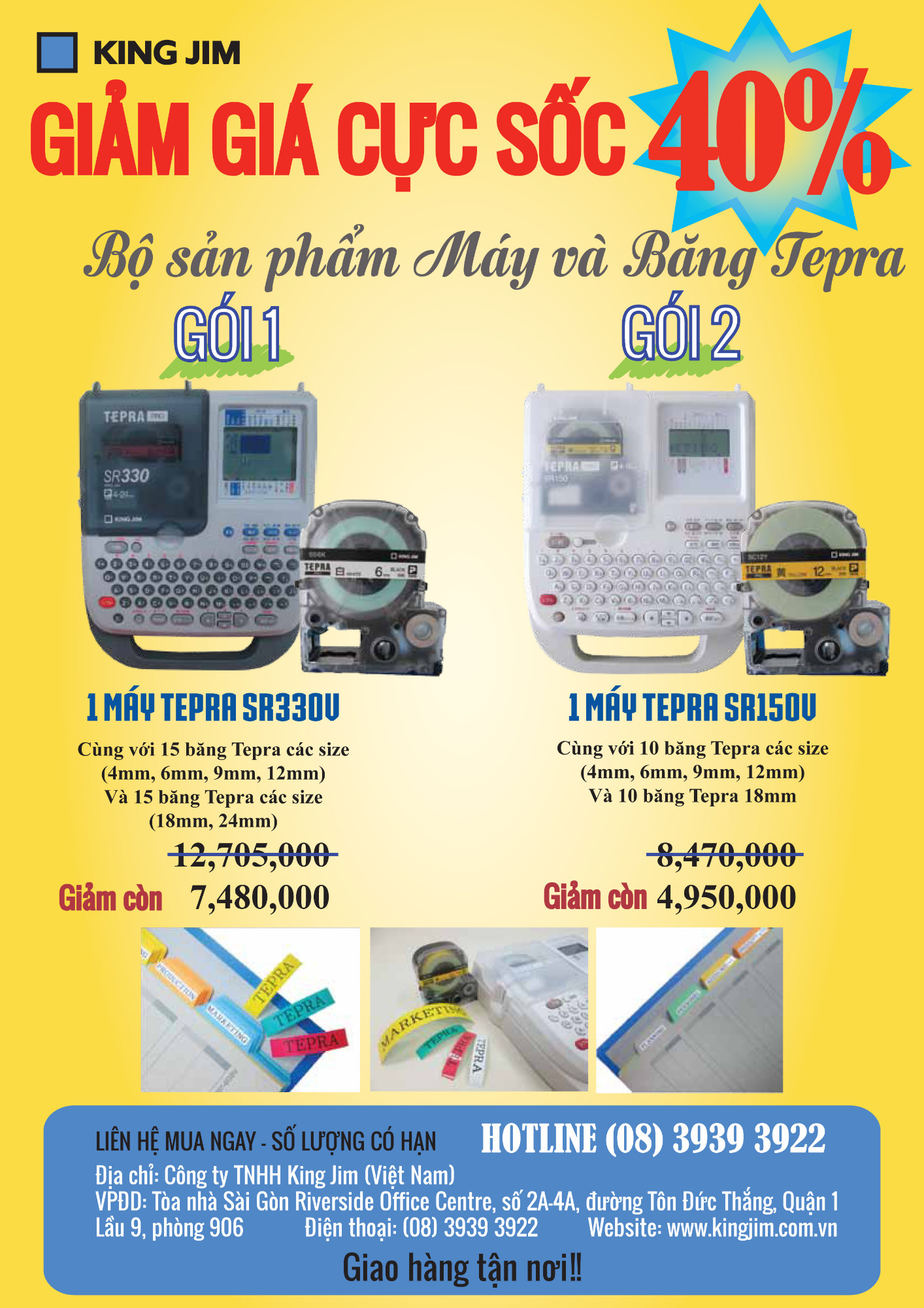 King Jim (Việt Nam) không ngừng nghiên cứu thị trường và cải tiến chức năng sản phẩm để phục vụ nhu cầu ngày càng cao của khách hàng. King Jim (Việt Nam) muốn đem đến cho khách hàng chương trình hấp dẫn “ Bộ sản phẩm Máy và Băng Tepra- giảm giá 40%”. Tham gia chương trình, khách hàng sẽ có cơ hội không những được sử dụng sản phẩm chất lượng vượt ngoài mong đợi mà còn tiết kiệm được 40% so với giá gốc.