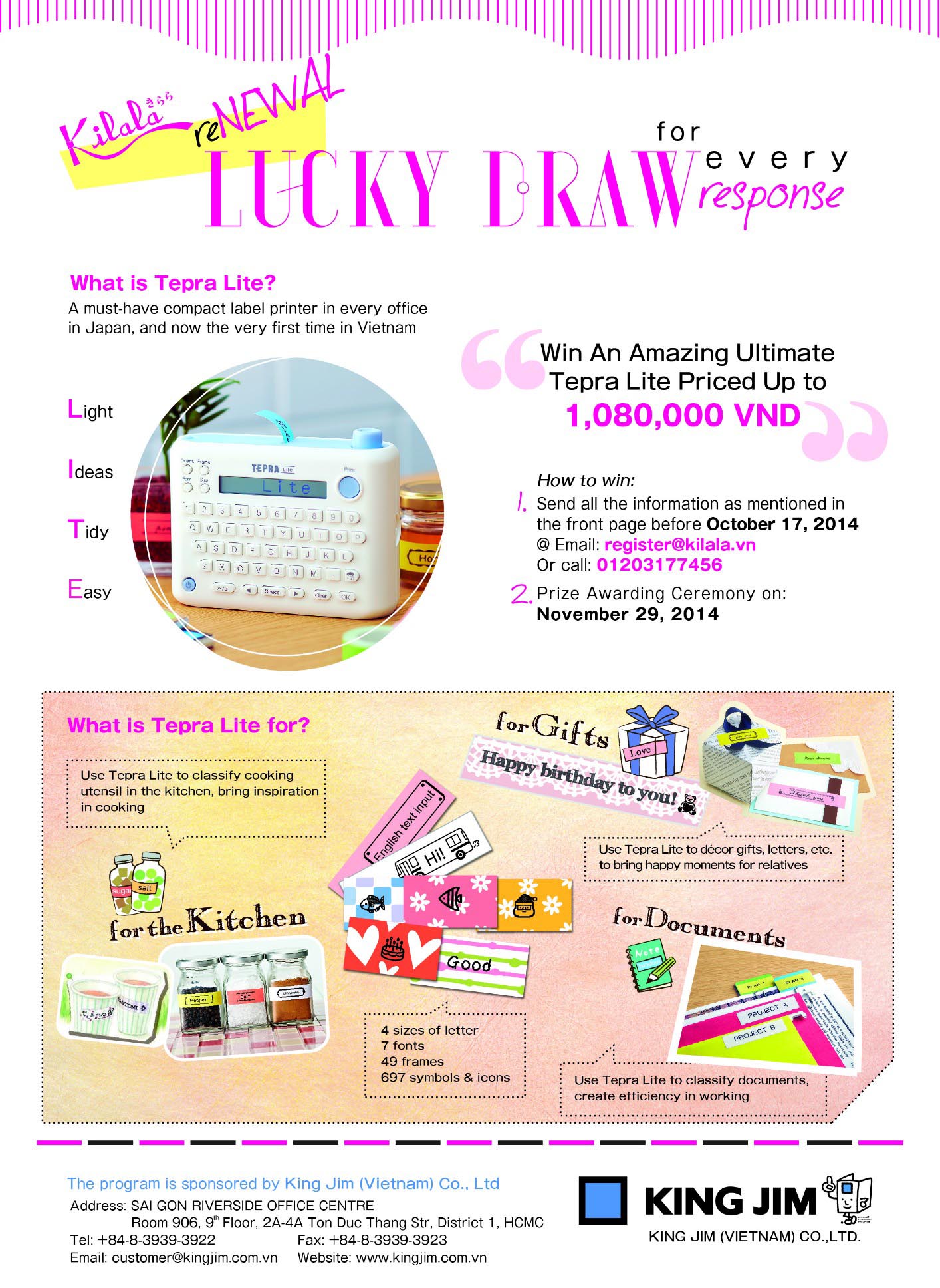 Đầu tháng 10/ 2014, tạp chí Kilala đã gởi thư đến các công ty Nhật với nội dung thông tin về chương trình bốc thăm trúng thưởng chiếc máy in nhãn xinh xắn Tepra Lite LR5E. Để có cơ hội nhận được phần thưởng, các công ty chỉ cần phản hồi lại cho Kilala thông qua email hoặc gọi điện để xác nhận thông tin chi tiết của công ty vào trước ngày 22/10/2014. Lễ bốc thăm và trao giải được diễn ra vào ngày 29/11/2014 tại tòa soạn của tạp chí Kilala tại thành phố Hồ Chí Minh.