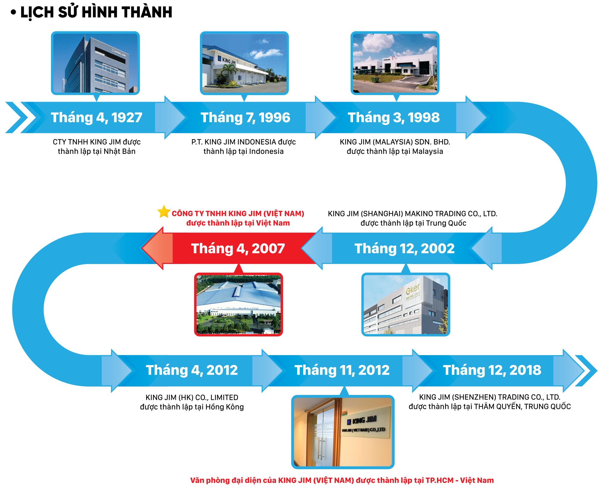 CÔNG TY TNHH KING JIM được thành lập vào năm 1927 tại Nhật Bản. Trải qua 97 năm hoạt động và phát triển, KING JIM đã trở thành thương hiệu được ưa chuộng và thành công không chỉ tại thị trường Nhật Bản mà còn ở nhiều quốc gia khác. Hiện tại, KING JIM có 3 nhà máy ở các nước như: Việt Nam, Indonesia, Malaysia và 3 Công ty Thương Mại ở Hồng Kông, Thượng Hải và Thâm Quyến cùng hệ thống phân phối ở nhiều quốc gia trên thế giới.