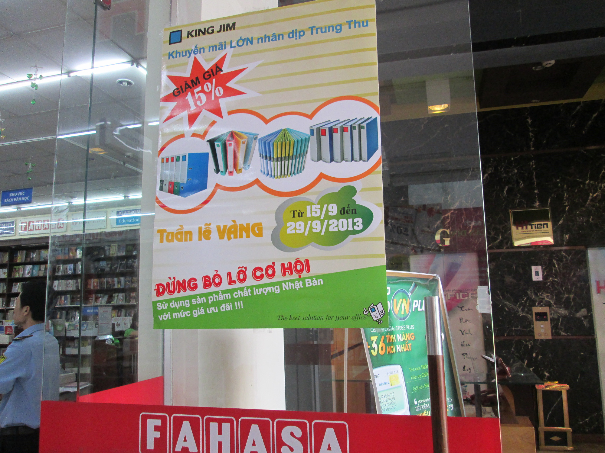Sau 3 ngày thực hiện chương trình khuyến mãi “ Giảm giá 15% cho tất cả mặt hàng bìa đựng hồ sơ của King Jim”, sự kiện này đã thu hút sự quan tâm của số lượng lớn khách hàng tại TP.HCM. King Jim (Viêt Nam) đã sử dụng hữu hiệu các công cụ marketing như: poster được dán ở mỗi nhà sách Fahasa để thể hiện nội dung của chương trình, kệ mica in dòng chữ “ Japan’ the number one filing company” và logo King Jim, cùng với những wobbler rất nổi bật được kẹp vào kệ trưng bày. Kết hợp với việc trưng bày sản phẩm bắt mắt và biểu tượng smile file vui nhộn, chương trình đã kích thích tính tò mò của hầu hết khách hàng khi đến nhà sách Fahasa.