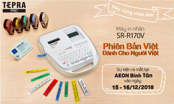 Để giới thiệu chiếc máy in nhãn Tepra PRO SR-R170V phiên bản tiếng Việt, King Jim (Việt Nam) sẽ tổ chức một sự kiện ra mắt sản phẩm với nhiều hoạt động thú vị tại Aeon Bình Tân vào ngày 15 và 16 tháng 12 năm 2018.