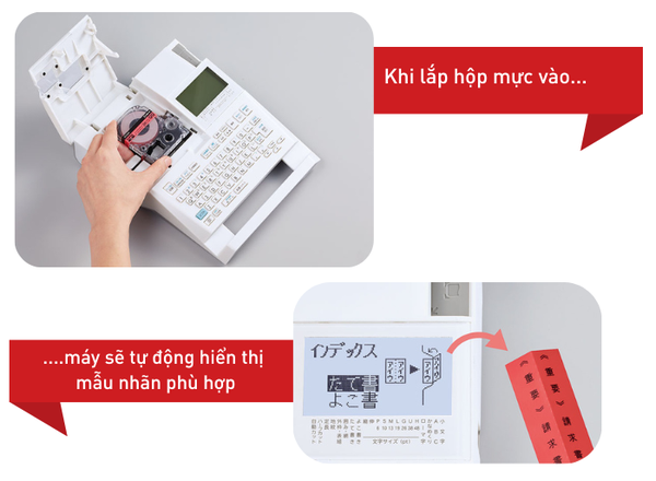 Tự động nhận diện loại băng nhãn Ngoài ra, máy còn tự động gọi ra định dạng in và các menu in đặc biệt phù hợp với loại băng nhãn, giúp tiết kiệm thời gian thao tác và cài đặt cho người dùng. |