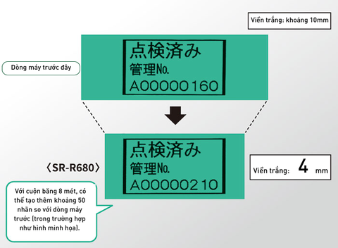 | Giảm thiểu lãng phí nhãn in: SR-R680 tối ưu hóa việc in nhãn bằng cách giảm thiểu phần dư thừa ở đầu và cuối nhãn, giúp tạo ra nhiều nhãn hơn từ một cuộn băng. So với các mẫu trước, phần dư thừa được giảm khoảng 6mm mỗi nhãn, cho phép in thêm khoảng 50 nhãn trên cuộn băng dài 8m. | |
